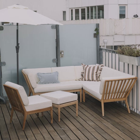 The Sienna Lounge Sofa is made of teak wood and has rounded wooden details that add a soft touch to the furniture.
