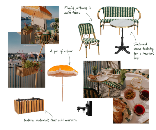 If you want to add colour to your balcony without compromising a calm and timeless look, these balcony furniture pieces are an ideal choice. The French Collection in green creates a harmonious and lightly playful style, while the Sally parasol in orange adds warmth and a summery feel. A teak balcony planter introduces natural materials that soften the overall look and create balance. For an exclusive and elegant finish, the balcony is completed with a tabletop in low-maintenance sintered stone.