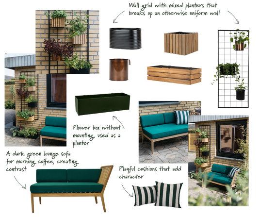 Teak furniture is not only timeless, but also designed to last for many years. Natural materials are an ideal choice, especially if you want to add warmth to your outdoor space, as they form a strong foundation for the overall look. By introducing a secondary colour – in this case green – you can work with different shades of the same colour and create a more playful expression without compromising the timeless aesthetic. In this setup, the green tones are expressed through the parasol, additional seating, balcony planters and textiles.