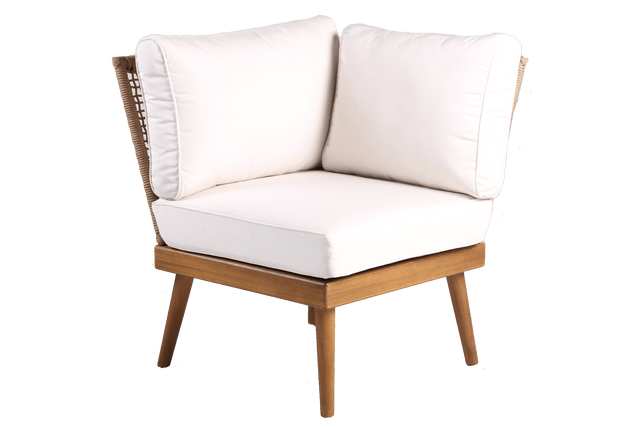 Regatta Rope lounge sofa is made from eucalyptus and maintenance-free wicker. The polyester rope is extra long lasting and durable and can withstand the harsh Scandinavian weather. This corner sofa module can be combined with either the left or right side lounge sofa and create a bigger lounge sofa. Or it can be used on its own as a cozy lounge chair. See the entire Regatta Rope lounge series here.